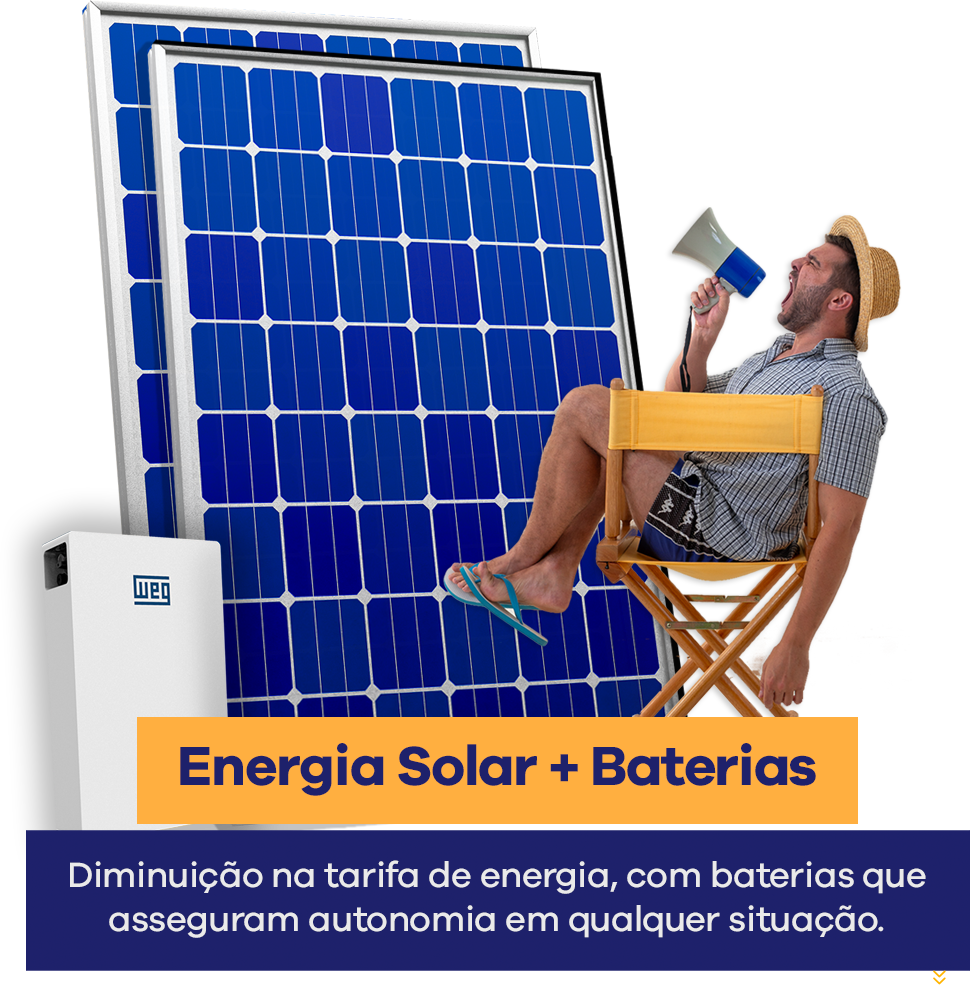 É a união da energia solar com um banco de baterias, que permite armazenar a eletricidade gerada pelos painéis durante o dia para ser utilizada à noite ou em casos de falta de energia da rede.